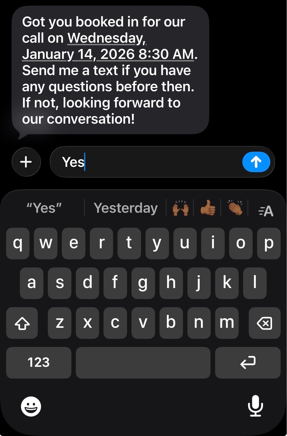 After booking, you’ll receive a confirmation email or text like this — everything you need to prepare for your call.